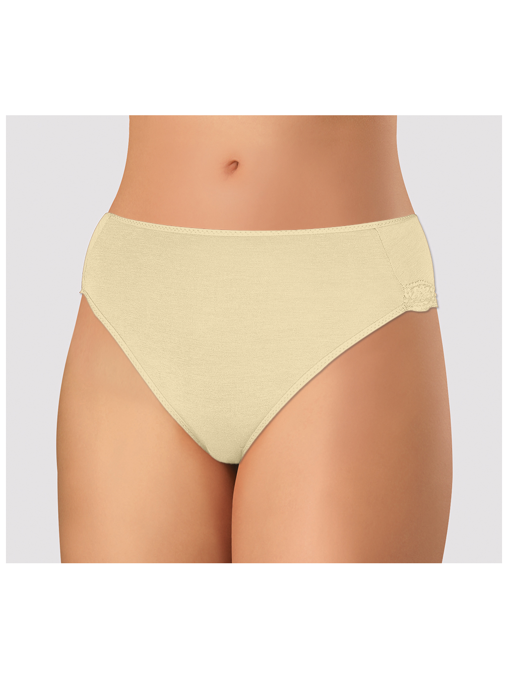 Dámske nohavičky klasického strihu. Nohavičky sú vyrobené z veľmi kvalitnej elastickej bavlny s prímesou vlákna Tactel, ktoré dodáva materiálu hebkosť a lesk. Materiál sa skvele prispôsobí postave a drží stály tvar bielizne. Pás je olemovaný elastickou paspulou. Nohavičky sú okolo nôh lemované elastickou čipkou. Bavlnený klin.