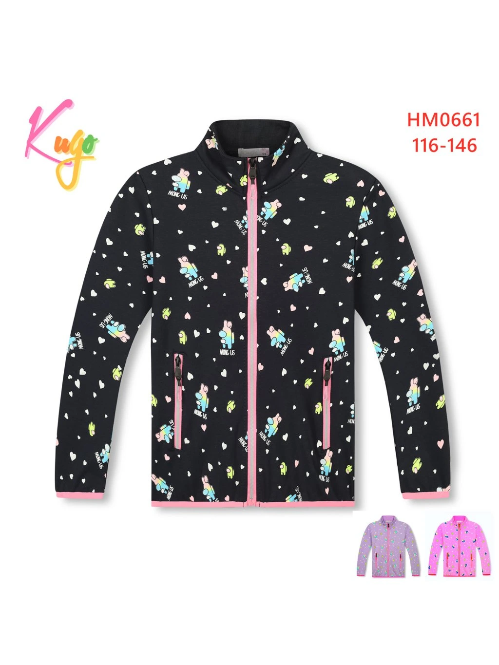 Dievčenská mikina ku krku, dve zapínacie vrecká na prednej strane, predĺžená zadná strana