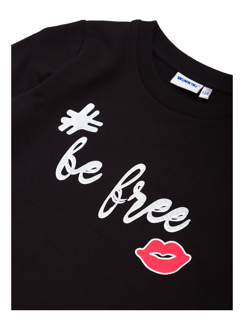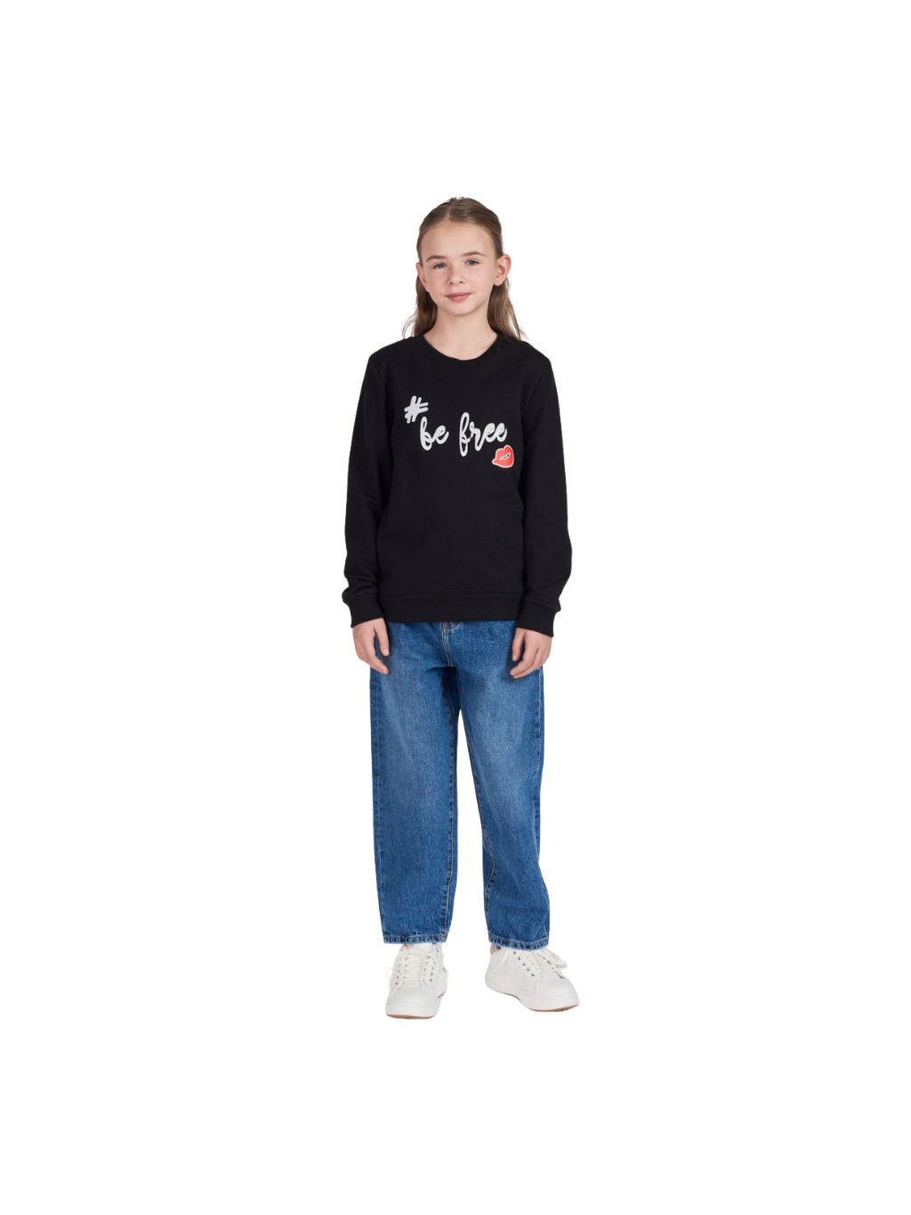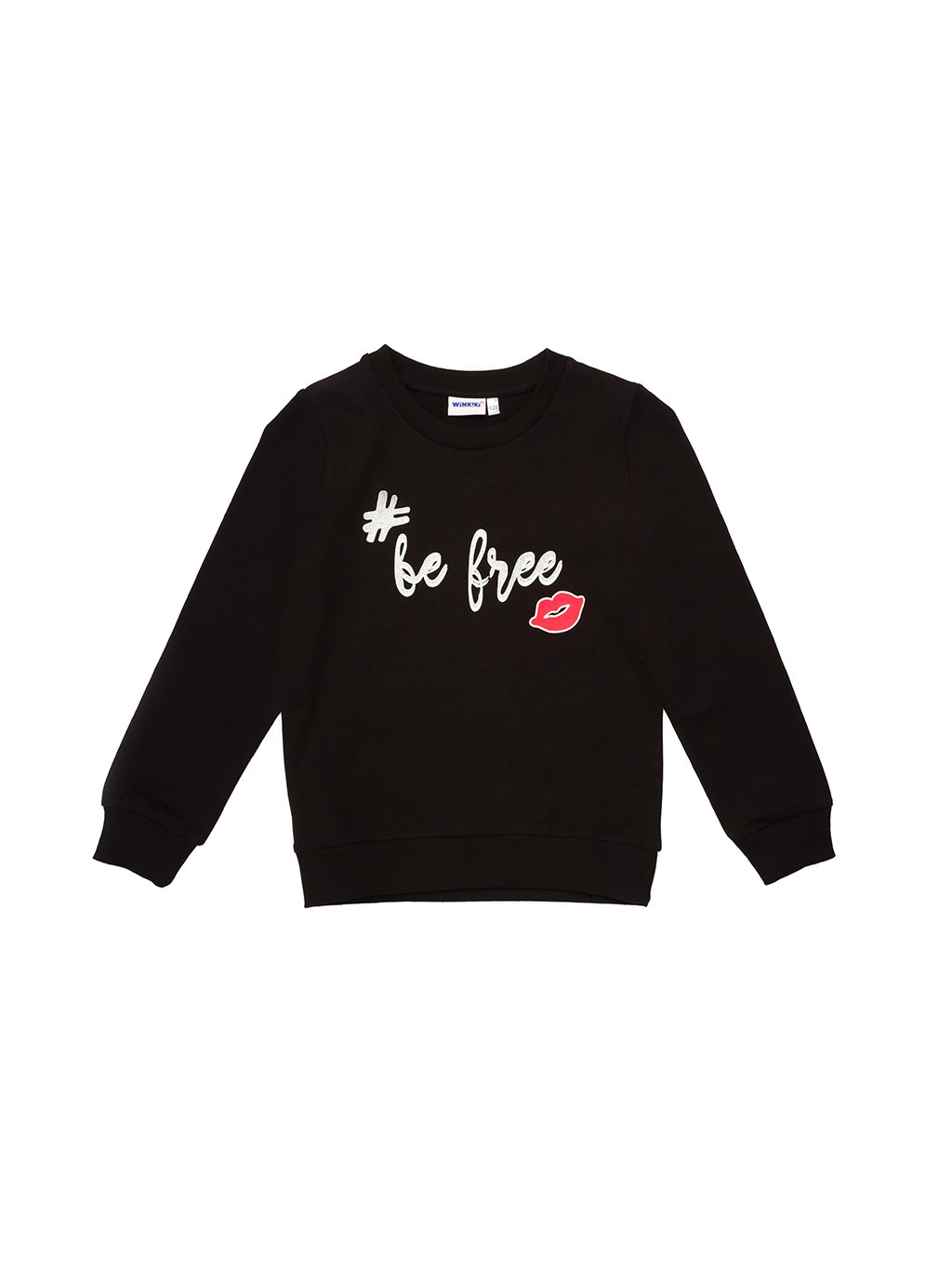Dievčenská mikina v čiernej farbe s dlhým rukávom a nápisom na prednej strane 'BE FREE'. Konce rukávov aj koniec mikiny je ukončený elastickými lemami. Látka: Footer (nečesaná teplákovina) 250-260 gr.