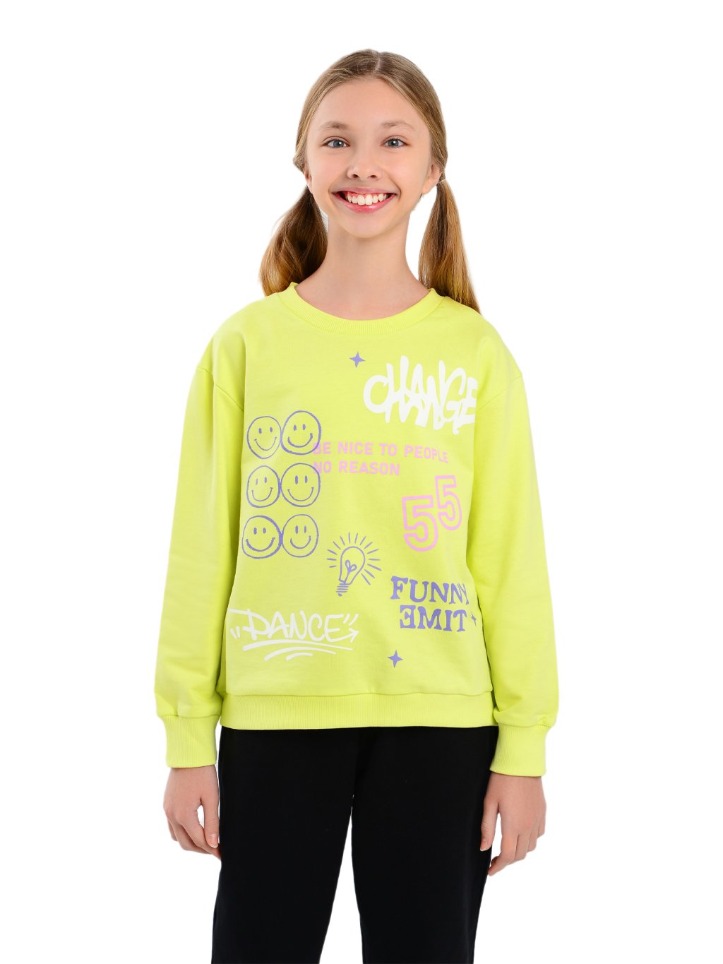 Dievčenská mikina Dance z kolekcie Comics. Farba žltá. Konce rukávov a spodný okraj s pružnými lemami. Kvalitné spracovanie. Látka: Footer nečesaná teplákovina 250 - 260 g.